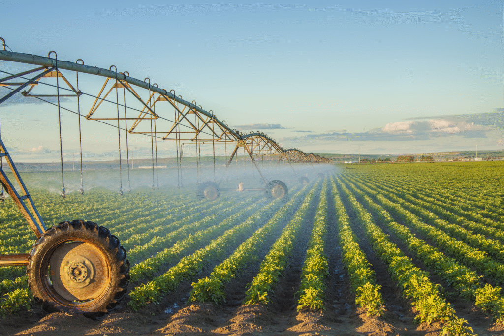 Water is distributed by overhead high-pressure sprinklers or guns from a central location in the field or from sprinklers on moving platforms.