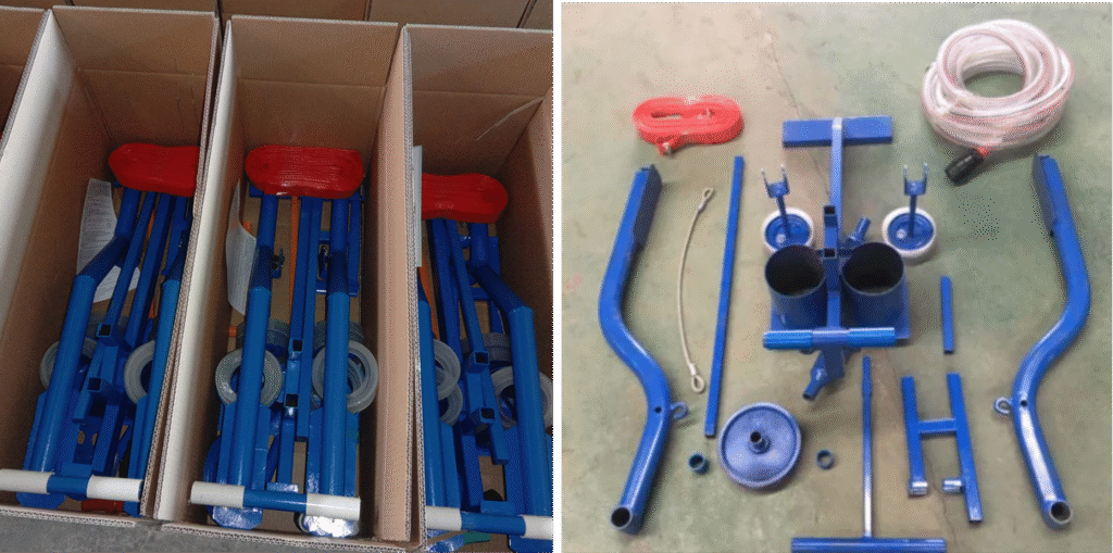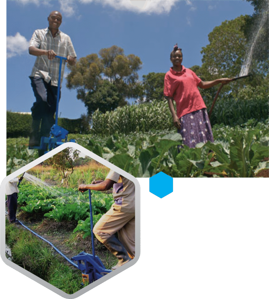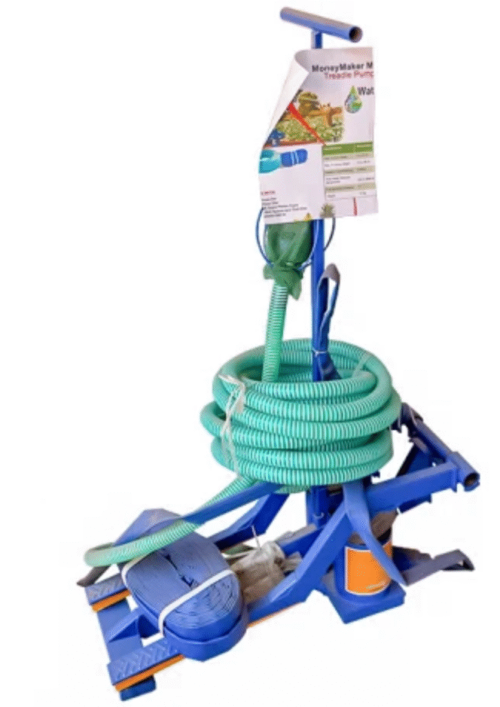 A treadle pump is a human-powered suction pump that is used for irrigation. It is designed to lift water from a depth of seven metres or less. The legs and feet step up and down on treadles that are connected to two small piston pumps.